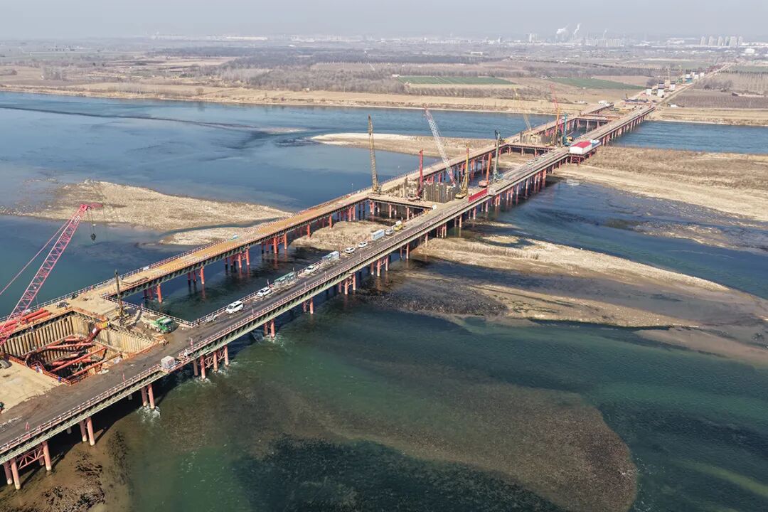 與此同時,新建焦濟洛平鐵路洛陽黃河公鐵大橋建設現場也是塔吊林立,機械轟鳴。工人們正在進行鉆孔樁、承臺和墩身施工,全力趕工期。